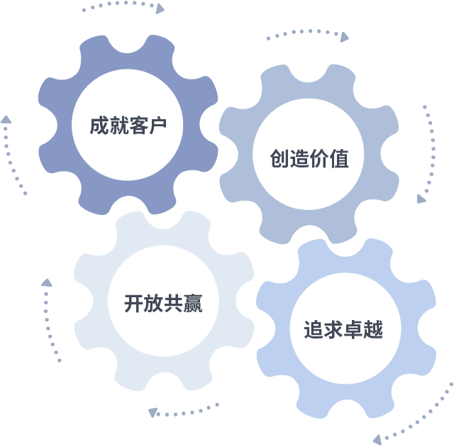 成就客户是一切决策的出发点,,创造价值是衡量所有工作的标准,,,,追求卓越是我们做事做人的态度,,开放共赢是我们的格局也是最终的结果。。。价值观的齿轮环环相扣,,推动着组织里的每个人不断向前。。